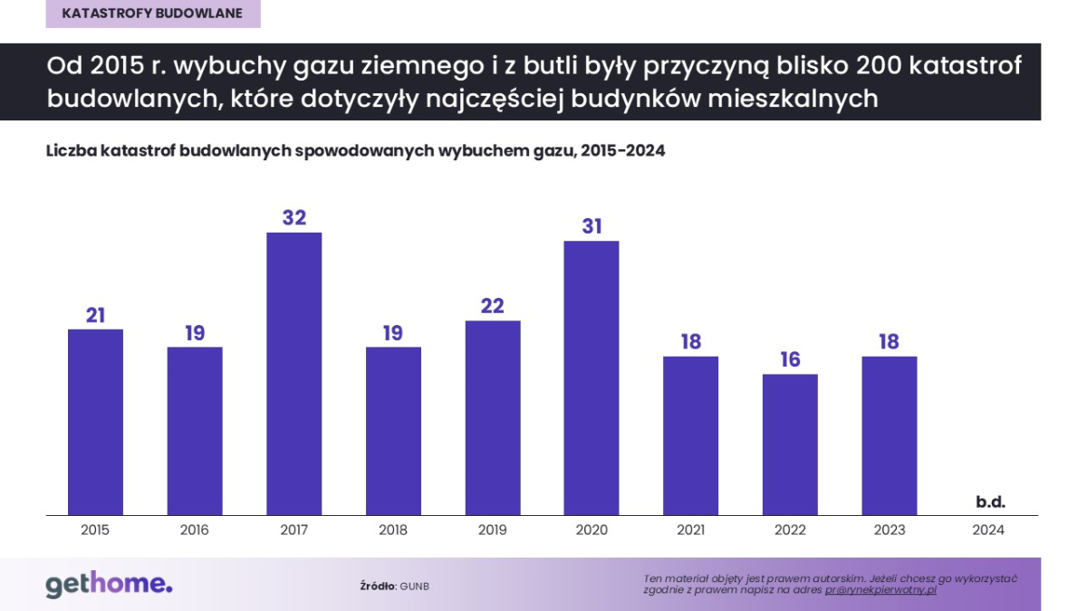 Skalę problemu pokazują dane Głównego Urzędu Nadzoru Budowlanego (GUNB). Tylko w 2017 r. wybuchy gazu ziemnego i z butli były przyczyną 32 katastrof budowlanych, a trzy lata później – 31. Urząd nie opublikował jeszcze danych za 2025 r., a w raporcie za 2024 r. nie wyszczególniono liczby zdarzeń spowodowanych wybuchem gazu. Z wyliczeń GetHome.pl wynika jednak, że od 2015 r. doszło do 196 takich katastrof.
