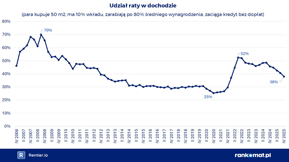 Biorąc jednak pod uwagę najnowsze dane NBP o cenach transakcyjnych na rynku pierwotnym w IV kw. 2025 roku dla 7 największych miast i uwzględniając obecny poziom oprocentowania, ten udział spadł do 38 proc. Oznacza to, że młodzi nareszcie są w stanie kupić przeciętnej wielkości mieszkanie w dużym mieście, mając przeciętnej wysokości dochody.