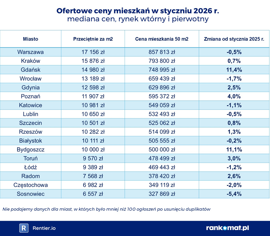 Ofertowe stawki w styczniu 2026 r. zaczynały się od 6 557 zł w Sosnowcu i dochodziły do poziomu 17 156 zł w Warszawie - za 1 m2 łącznie dla rynku pierwotnego i wtórnego. W 12 na 17 miast metr kwadratowy był oferowany za co najmniej 10 tys. zł, a tuż poniżej tej granicy znalazły się Łódź (9 389 zł) i Toruń (9 570 zł).